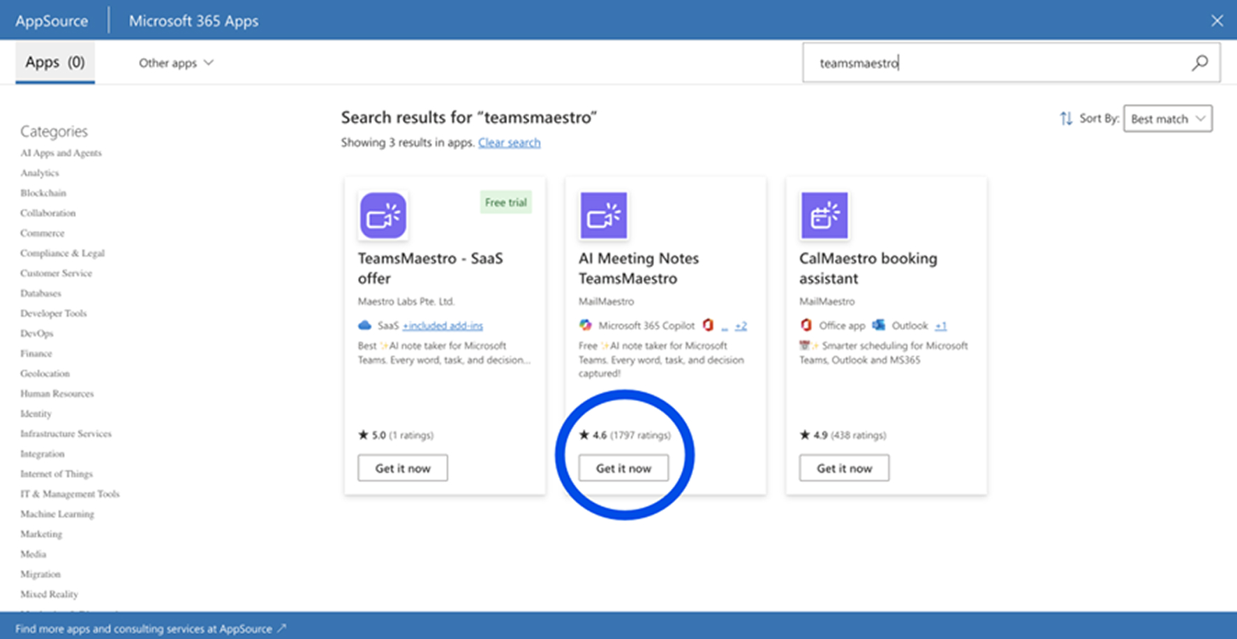 3. In the new window, use the search bar on the top right to find TeamsMaestro.Click Get it now once it appears in the search results.