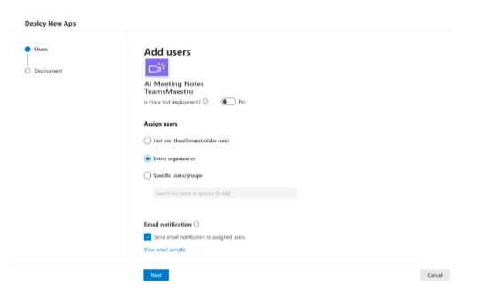 5. Assign the users you want to grant access to TeamsMaestro. You can deploy TeamsMaestro for yourself, for your entire organization, or for selected specific user groups. For instance, if you want to launch a pilot, were commend creating a group and assigning it there.